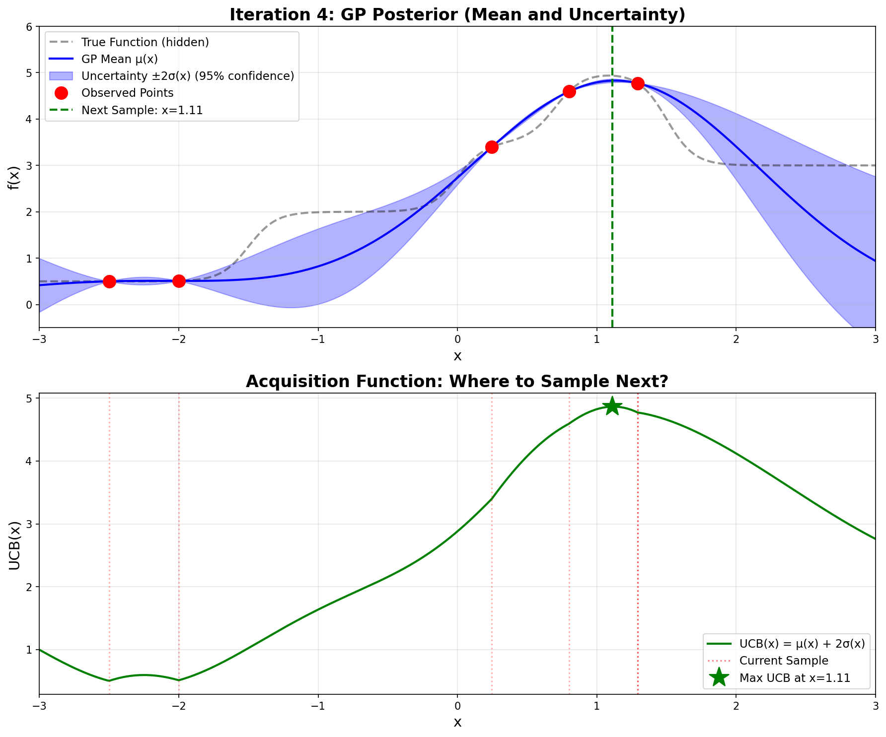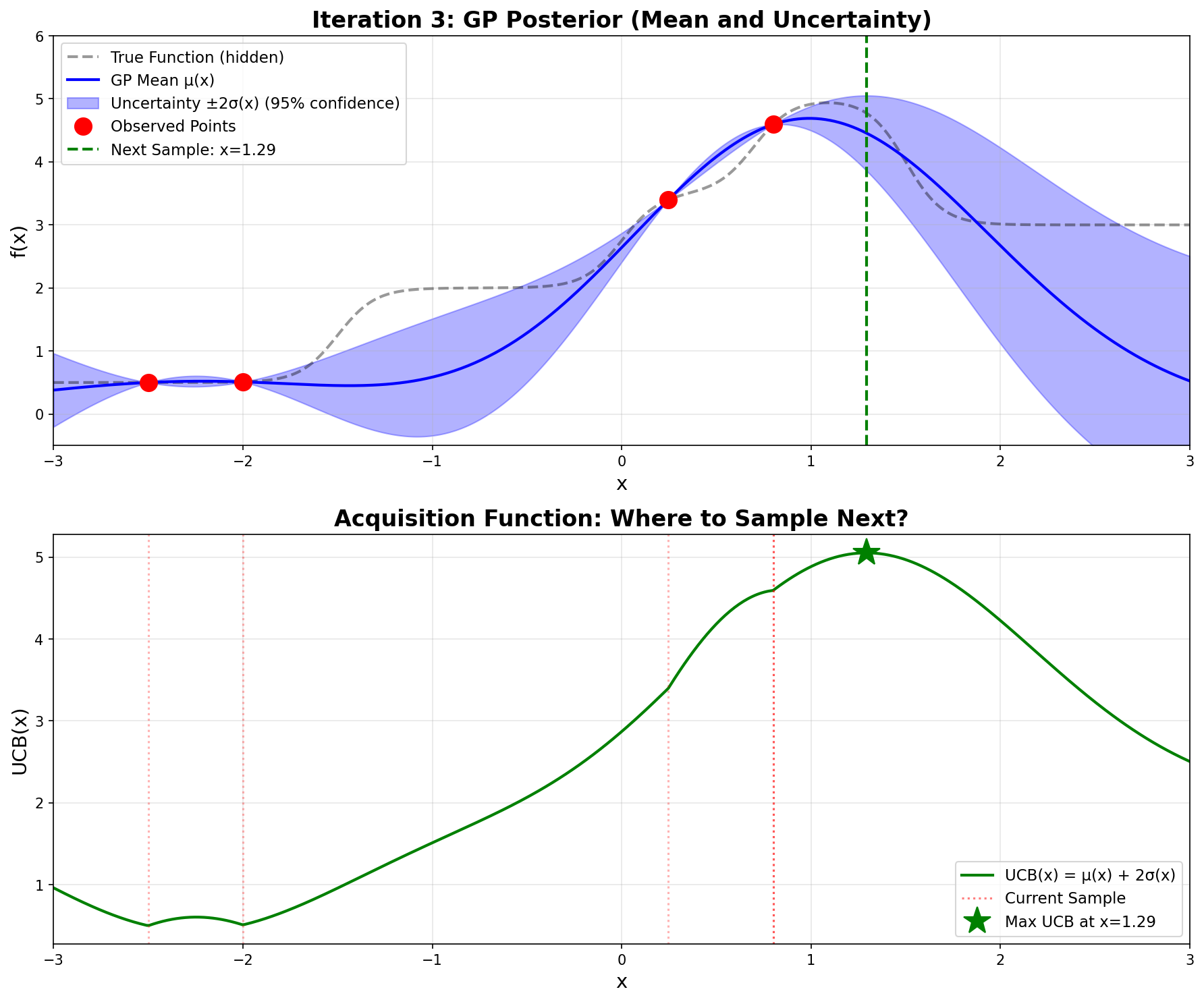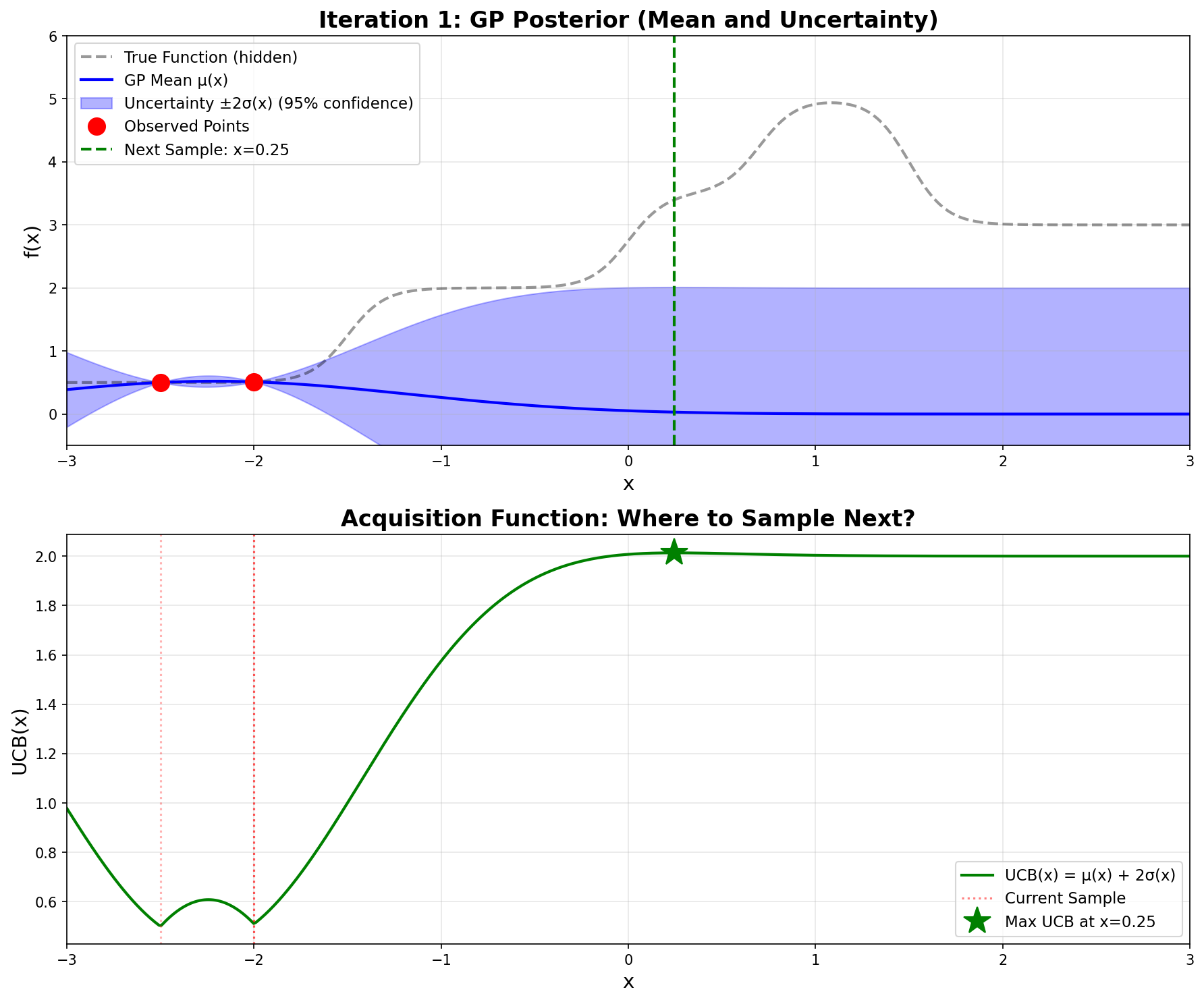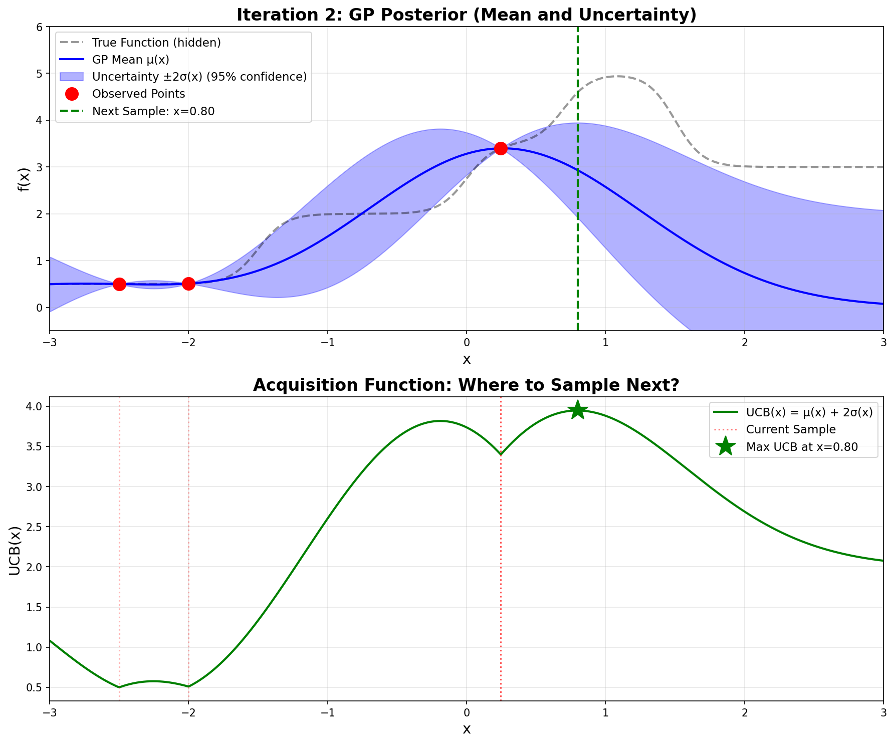 Bottom plot: The green curve shows \(\text{UCB}(x)\). The maximum occurs at \(x = 0.246\) (green star), which becomes our next sampling point.