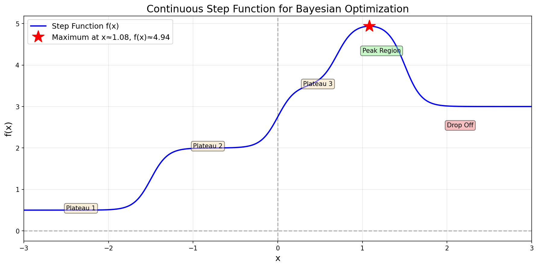 This function has multiple plateaus with a maximum around \(x^* \approx 1.08\) where \(f(x^*) \approx 4.94\). The challenge: we don’t know the function’s form—we can only evaluate it at specific points.