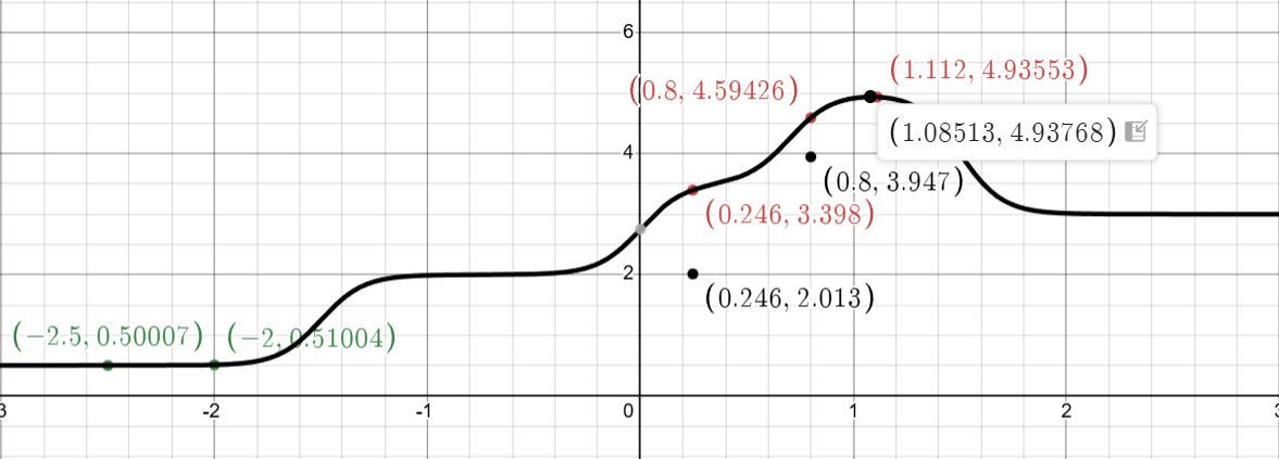 At \(x = -2.5\) and \(x = -2.0\), we observed \(f(x) \approx 0.5\). The GP, using the RBF kernel with length scale \(\ell = 1.0\), assumes the function is smooth. As we move away from these points: