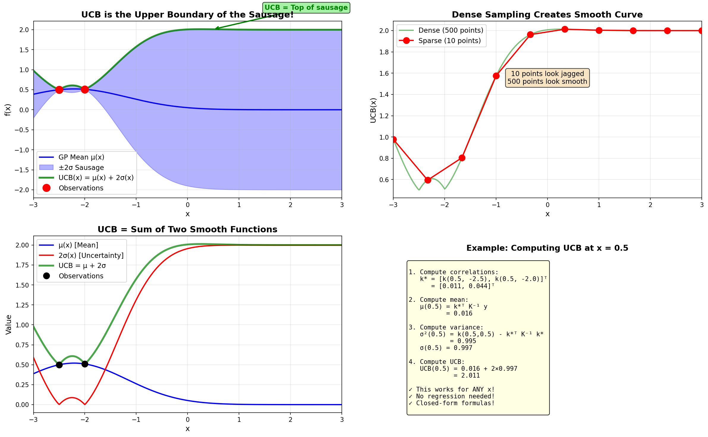 The smoothness of the sausage curve comes from the Gaussian Process itself—the RBF kernel creates smooth correlation functions, making both \(\mu(x)\) and \(\sigma(x)\) inherently smooth. Therefore \(\text{UCB}(x) = \mu(x) + 2\sigma(x)\) is also smooth.