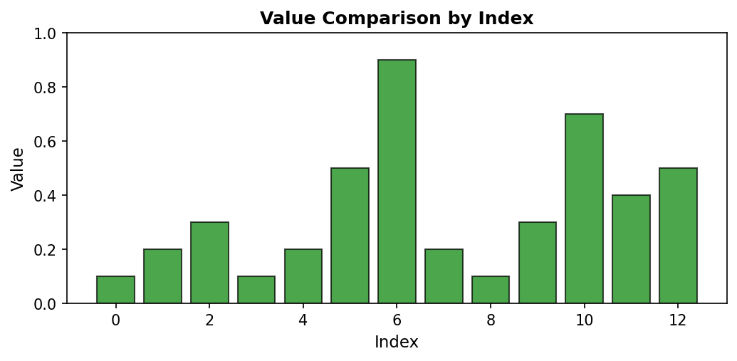 Figure 1.1.5.3: Bar plot emphasizing magnitude differences. The visual “weight” of each bar makes it easy to compare values at a glance. Index 6’s bar (0.9) clearly dominates, while indices 0, 3, and 8 have the shortest bars (0.1).