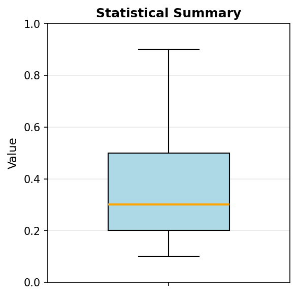 Figure 1.1.5.5: Box plot showing the five-number summary. The box spans from Q1 (~0.2) to Q3 (~0.5), containing the middle 50% of data. The orange line marks the median (~0.3). Whiskers extend to the minimum (0.1) and maximum (0.9), with the maximum potentially marked as an outlier depending on the IQR criterion.