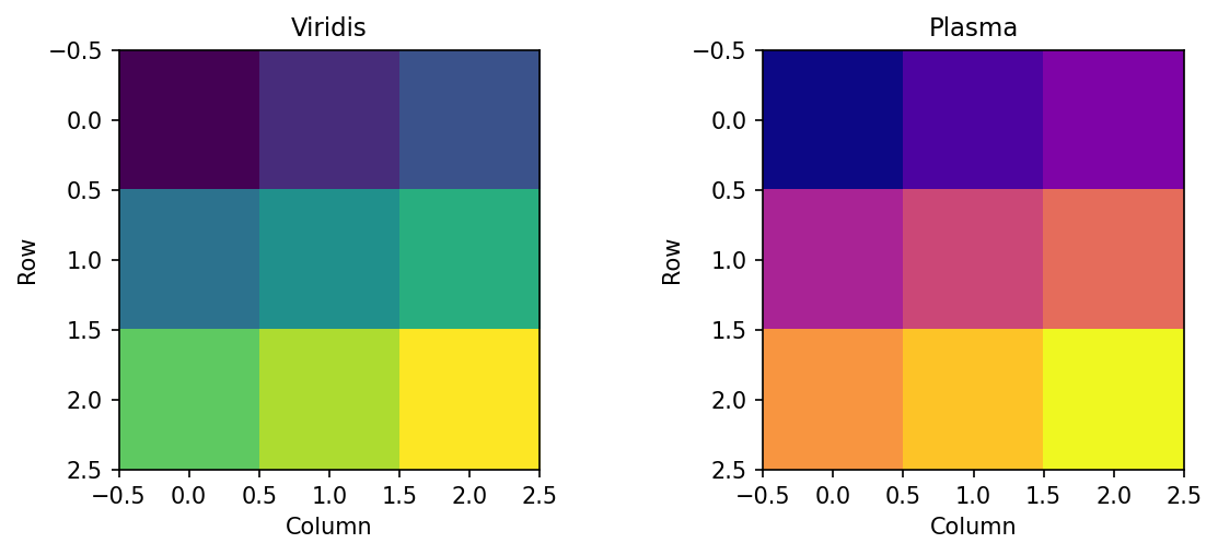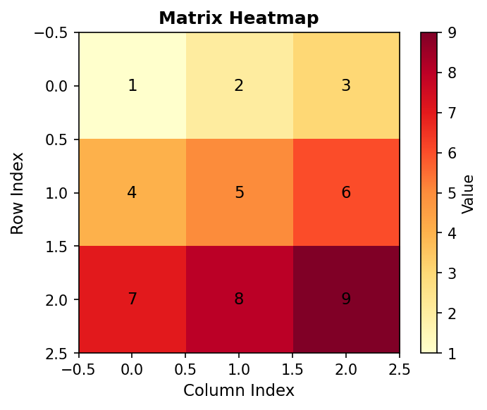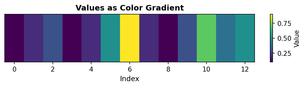 Code explanation: The imshow() function expects 2D data, so we wrap our 1D array in brackets: [a] creates a 1×13 array. cmap='viridis' applies the viridis colormap (purple for low values, yellow for high). aspect='auto' adjusts the aspect ratio to fill the figure. The colorbar provides a legend mapping colors to values.