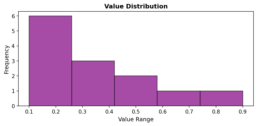 Code explanation: The hist() function automatically groups data into bins and counts occurrences in each bin. bins=5 divides the range [0.1, 0.9] into 5 equal-width intervals. Note that the x-axis now represents value ranges (not indices), and the y-axis shows how many measurements fell within each range.