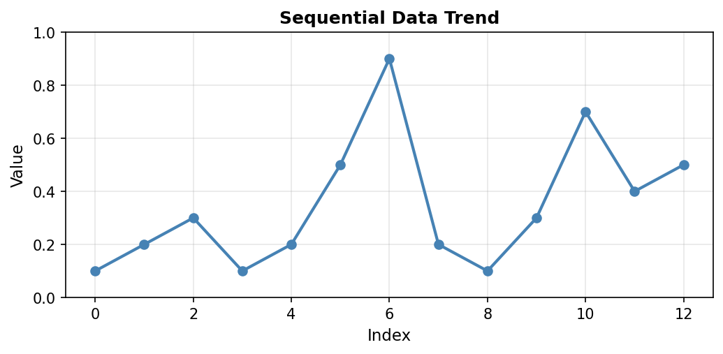 Figure 1.1.5.1: Line plot showing the data trend. Notice the peak at index 6 (value=0.9) and the secondary peak at index 10 (value=0.7). The connecting lines reveal the overall pattern of variation in the measurements.