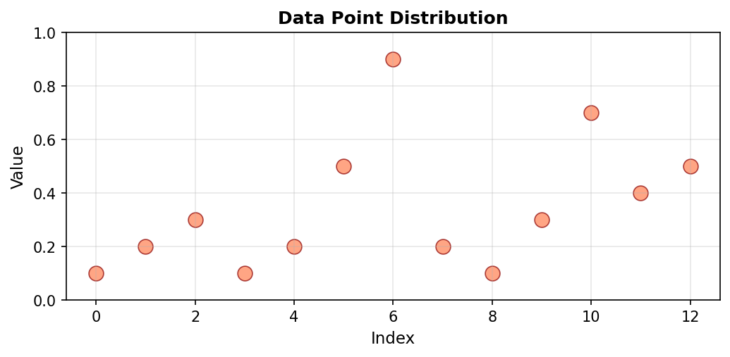 Figure 1.1.5.2: Scatter plot of the same data. Without connecting lines, individual measurements stand out clearly. The maximum value at index 6 (0.9) is easily identified as an outlier compared to most other values which cluster below 0.5.