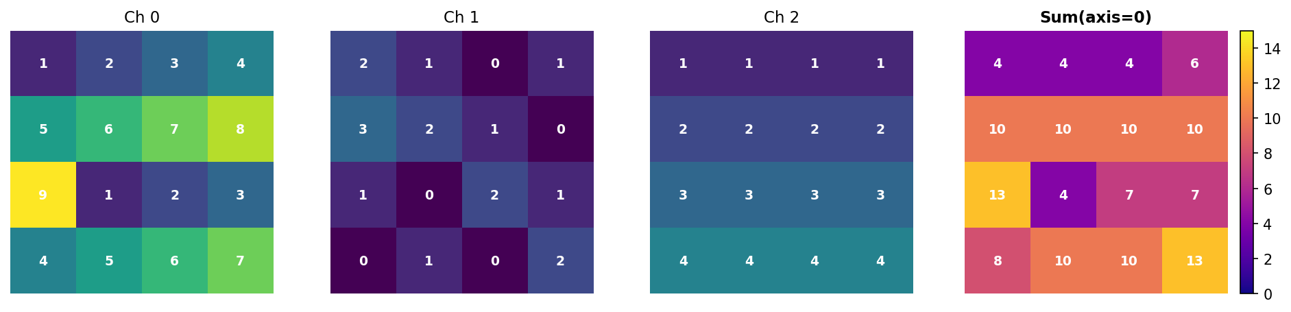 np.sum(A, axis=(1, 2))- what shape? What values? - Calculate