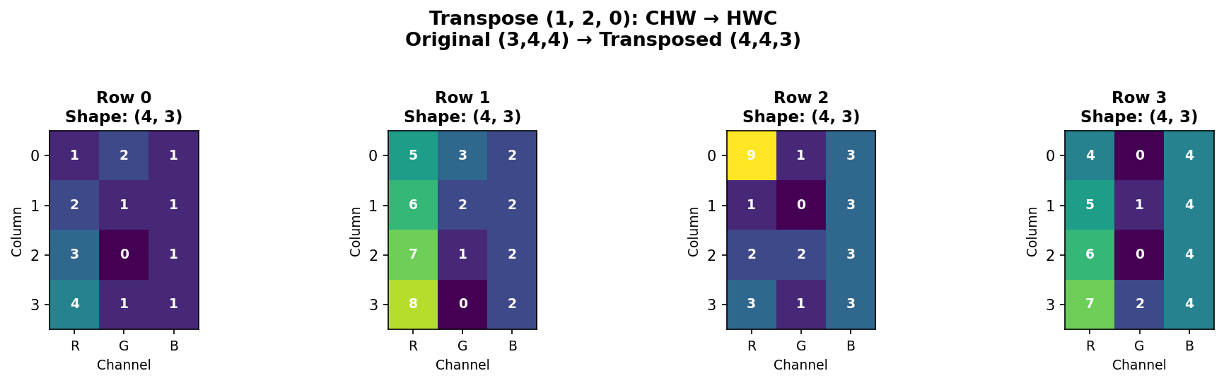 reshaped[0, 0, :]andtransposed[0, 0, :]- explain the difference
