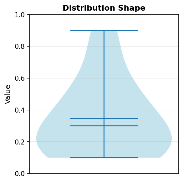 Figure 1.1.5.6: Violin plot revealing the distribution density. The violin is widest in the 0.1-0.3 range, indicating high density of measurements there. The narrow section around 0.6-0.8 shows few measurements in this range. The violin shape reveals information that the box plot summarizes more abstractly.