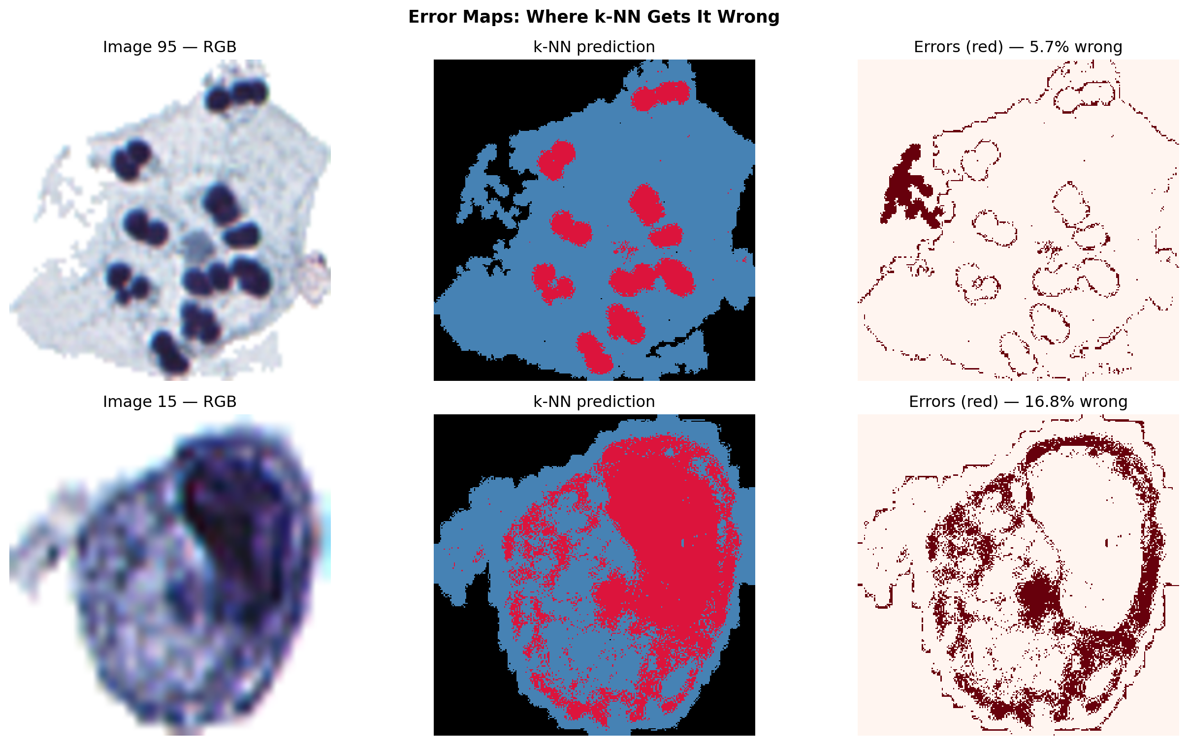k-NN makes decisions based only on pixel colour. It has no idea whether a pixel is near the centre of the cell, at a boundary, or in the background. This leads to two characteristic failure modes: