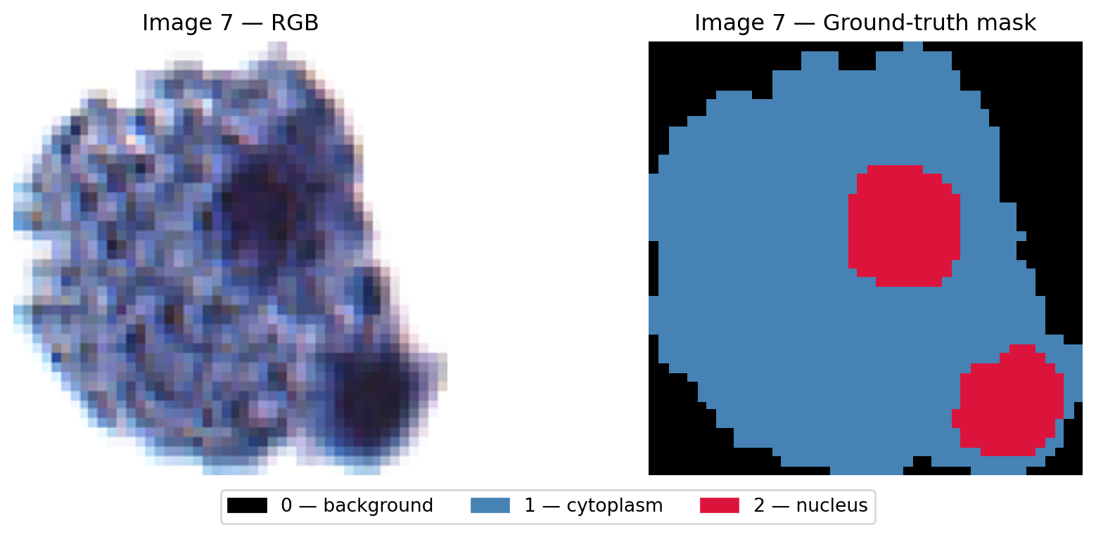 import globimport osimport numpy as npimport matplotlib.pyplot as pltimport matplotlib.patches as mpatchesfrom matplotlib.colors import ListedColormap# ── Load dataset ──────────────────────────────────────────────────────────────# X: (N, 3, H, W) float32 0–1 (channels first)# y: (N, H, W) int64 0/1/2try: _base ="C:/projects/VocEd" N =len(glob.glob(f"{_base}/imagedata/X/*.npy")) X = np.stack([np.load(f"{_base}/imagedata/X/{i}.npy") for i inrange(N)]) y = np.stack([np.load(f"{_base}/imagedata/y/{i}.npy") for i inrange(N)])exceptException:import subprocessifnot os.path.isdir("VocEd"): subprocess.run(["git", "clone", "https://github.com/emilsar/VocEd.git"], check=True) N =len(glob.glob("VocEd/imagedata/X/*.npy")) X = np.stack([np.load(f"VocEd/imagedata/X/{i}.npy") for i inrange(N)]) y = np.stack([np.load(f"VocEd/imagedata/y/{i}.npy") for i inrange(N)])# ── Visualisation helpers ─────────────────────────────────────────────────────mask_cmap = ListedColormap(['black', 'steelblue', 'crimson'])legend_patches = [ mpatches.Patch(color='black', label='0 — background'), mpatches.Patch(color='steelblue', label='1 — cytoplasm'), mpatches.Patch(color='crimson', label='2 — nucleus'),]# ── Dice helper (reused throughout the chapter) ───────────────────────────────def dice_score(pred, target, cls): pred_mask = (pred == cls) target_mask = (target == cls) intersection = (pred_mask & target_mask).sum() denom = pred_mask.sum() + target_mask.sum()return1.0if denom ==0else2* intersection / denomprint(f"Loaded {N} images. Image shape: {X[0].shape} Label shape: {y[0].shape}")