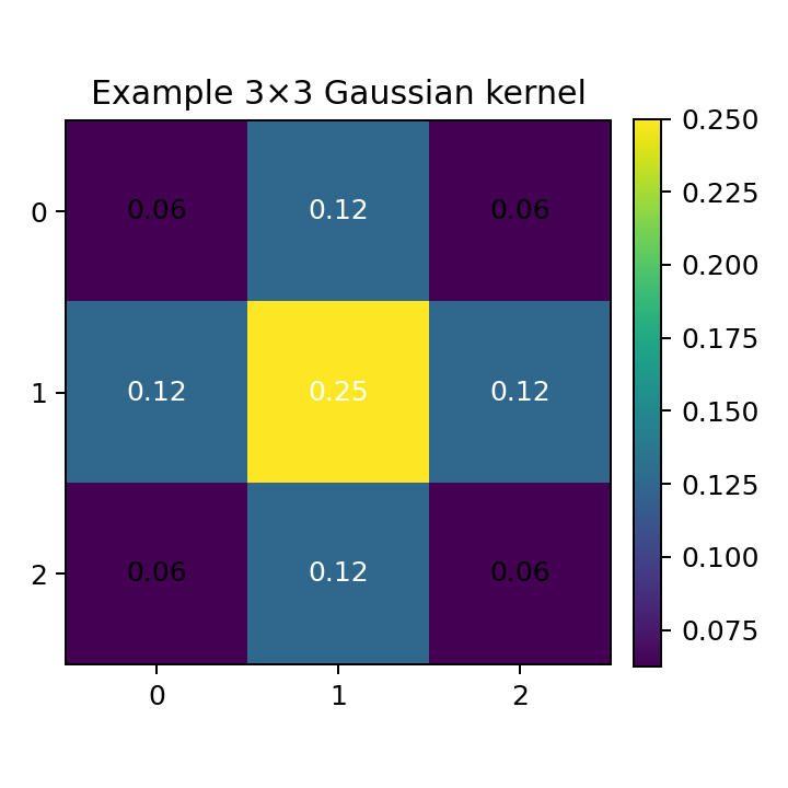 - The Gaussian envelope (\(\exp\) term) weights entries by distance from center — full weight at \((0,0)\), tapering toward the edges. This is exactly like a Gaussian blur kernel.