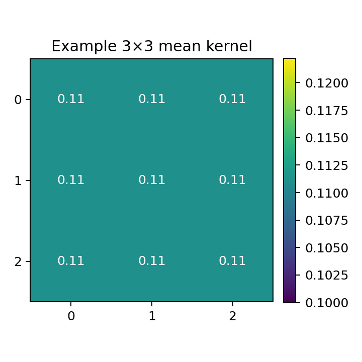 For a \(3\times 3\) mean filter: \[K_{\text{mean}}=\frac{1}{9} \begin{bmatrix} 1&1&1\\ 1&1&1\\ 1&1&1 \end{bmatrix}\]