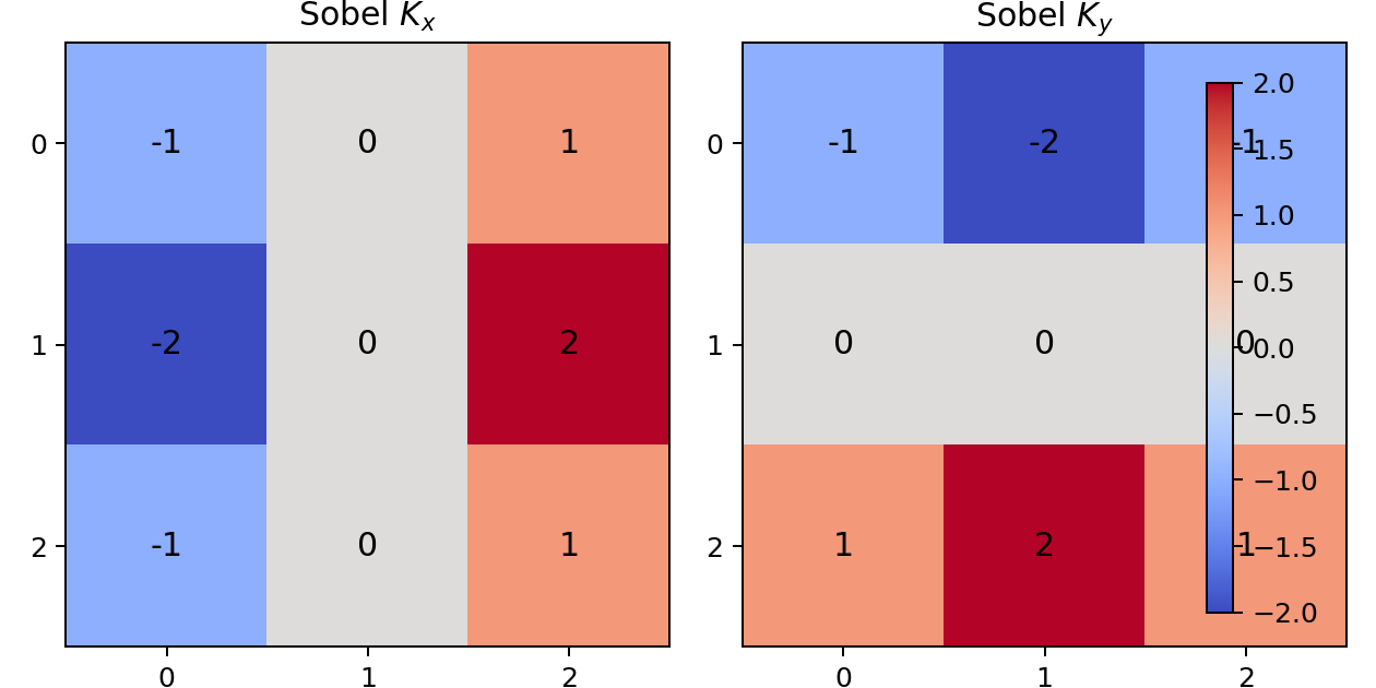 \[K_x= \begin{bmatrix} -1&0&1\\ -2&0&2\\ -1&0&1 \end{bmatrix}, \qquad K_y= \begin{bmatrix} -1&-2&-1\\ 0&0&0\\ 1&2&1 \end{bmatrix}\]